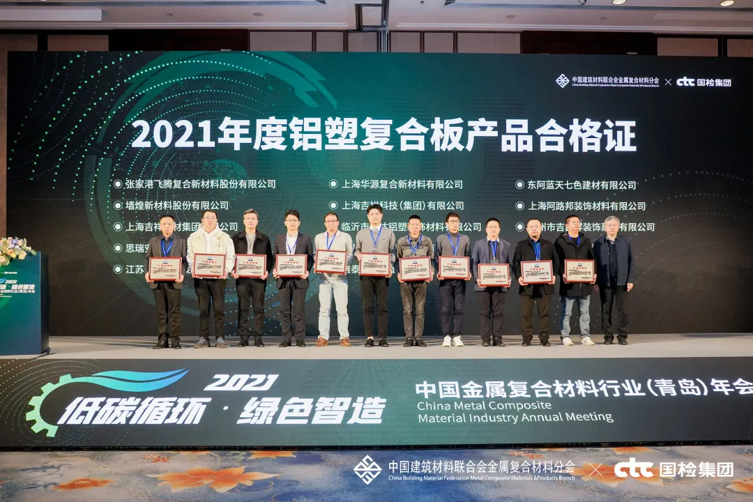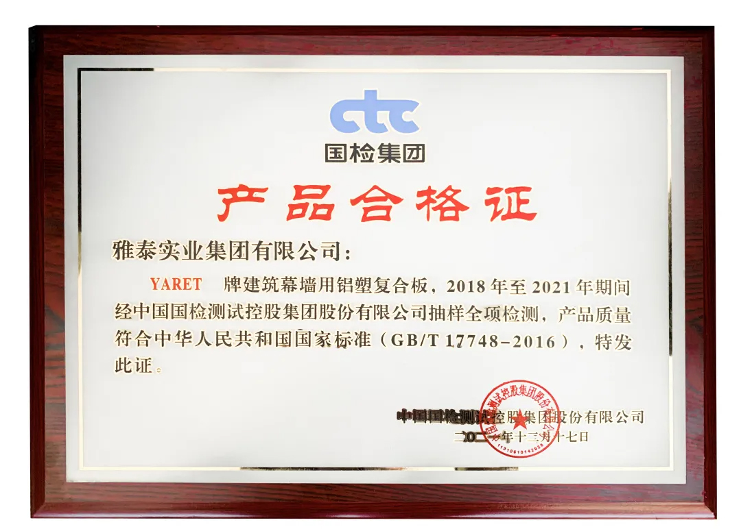 會上,對2021年度行業(yè)優(yōu)秀的產(chǎn)品與企業(yè)進(jìn)行了表彰頒獎——雅泰 YARET 牌鋁塑復(fù)合板,于2018年至2021年期間經(jīng)中國建材檢驗(yàn)認(rèn)證集團(tuán)股份有限公司抽樣全項(xiàng)檢測,產(chǎn)品質(zhì)量符合中華人民共和國國家標(biāo)準(zhǔn)(GB/T 17748-2016),榮獲2021年度CTC認(rèn)證產(chǎn)品合格證。