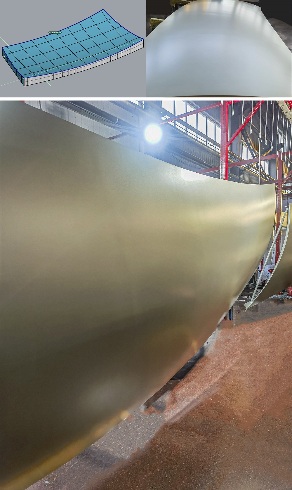 值得一提是的主樓八根香檳色鋁板巨型角柱,該工藝為鋁幕墻制造工藝中最復(fù)雜的雙曲,每根柱子由54個(gè)雙曲單體構(gòu)成,每個(gè)單體面積約8平方,雙曲面經(jīng)過工匠們精心打磨,才成就流暢的單元體線條。難度最大的是,所有拼成柱體的板件尺寸大多為特大1800*6000mm異型板,采用單元板式設(shè)計(jì),每件板超寬、超長,單件板重達(dá)130kg,相當(dāng)于2個(gè)成年人的重量。每次鈑金、轉(zhuǎn)序、從噴涂隧道順利噴漆完成,都十分的小心,傾注雅泰所有操作者的心血。