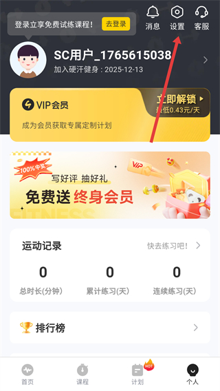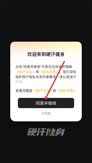 1、閱讀《用戶協(xié)議》與《隱私政策》后,點(diǎn)擊彈窗中的“同意并繼續(xù)”按鈕,進(jìn)入硬汗健身的個(gè)人頁面。