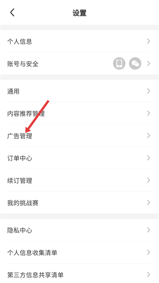3、在設(shè)置頁面中,找到并點(diǎn)擊“廣告管理”選項(xiàng),進(jìn)入廣告偏好的配置頁面。