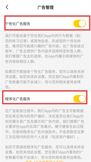 4、在廣告管理頁面,可根據(jù)需求開啟/關(guān)閉“個(gè)性化廣告服務(wù)”“程序化廣告服務(wù)”對(duì)應(yīng)的開關(guān),完成廣告展示偏好的設(shè)置。