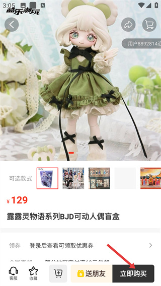 4、進(jìn)入商品詳情頁后,點(diǎn)擊底部的“立即購買”按鈕,即可進(jìn)入該BJD盲盒商品的購買流程。