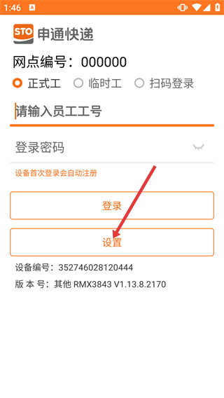 1、在申通快遞登錄頁(yè),選身份類(lèi)型后輸入【員工工號(hào)】-【登錄密碼】,點(diǎn)擊【設(shè)置】按鈕,可進(jìn)入對(duì)應(yīng)的配置操作界面。