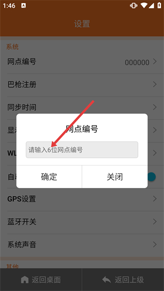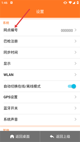 2、進(jìn)入【設(shè)置】頁(yè)面,能看到【網(wǎng)點(diǎn)編號(hào)】-【巴槍注冊(cè)】等系統(tǒng)選項(xiàng),還可配置WLAN-自動(dòng)切換在線(xiàn)/離線(xiàn)模式等功能。