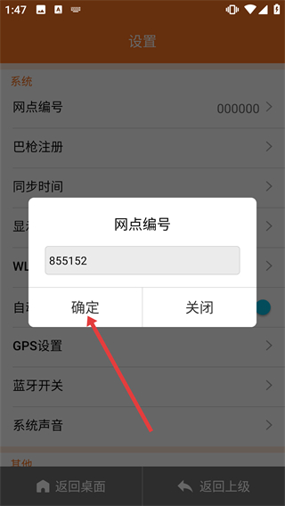 4、在網(wǎng)點(diǎn)編號(hào)輸入框填入對(duì)應(yīng)編號(hào)后,點(diǎn)擊彈窗中的【確定】按鈕,即可完成網(wǎng)點(diǎn)編號(hào)的相關(guān)設(shè)置操作。