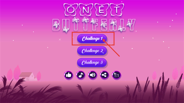 1、看到【ONETBUTTERFLY】界面,點擊紅色框選的【Challenge1】按鈕,進入首個蝴蝶連連看挑戰(zhàn)關卡,開啟本次消除游戲游玩。