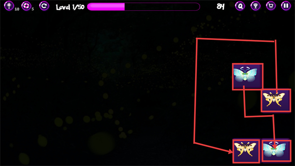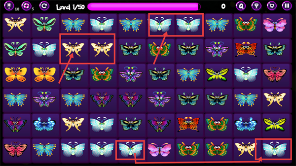2、進入關卡后,點擊紅色框選的相同蝴蝶圖案,將其連線消除,積累分數(shù)的同時推進本次連連看的關卡進度。