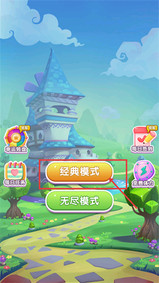 1、在游戲主界面,點(diǎn)擊紅色框選的【經(jīng)典模式】按鈕,進(jìn)入經(jīng)典消除關(guān)卡,開(kāi)啟本次以得分通關(guān)為目標(biāo)的游玩環(huán)節(jié)。