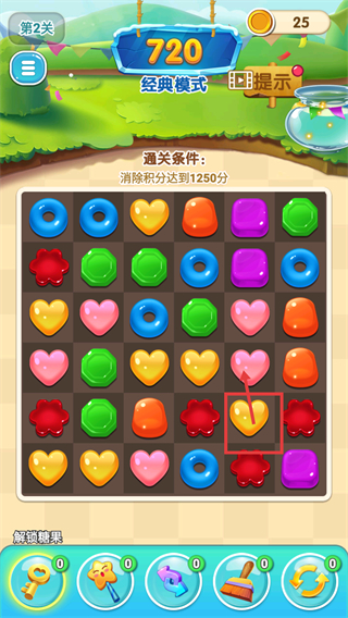 2、進(jìn)入經(jīng)典模式第2關(guān)后,點(diǎn)擊紅色框選的相同愛(ài)心元素,將其消除以積累分?jǐn)?shù),逐步向1250分的通關(guān)條件推進(jìn)。