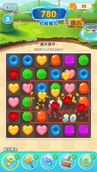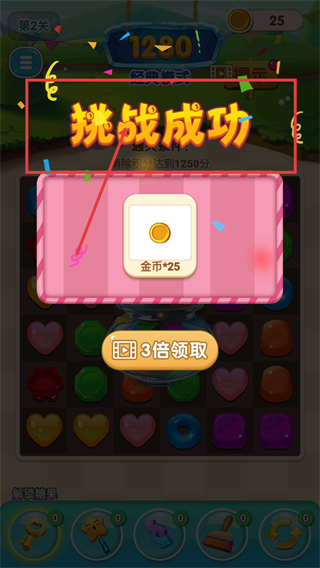 5、通關(guān)即可獲得金幣獎(jiǎng)勵(lì),金幣可在商店兌換實(shí)用道具,非必要時(shí)使用道具能高效消除糖果,降低闖關(guān)難度。
