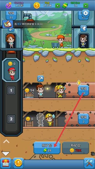 2、在礦場界面找到【新礦層】按鈕,該按鈕需消耗【超級現金】,點擊它推進解鎖礦層流程,無需擔心資源消耗。