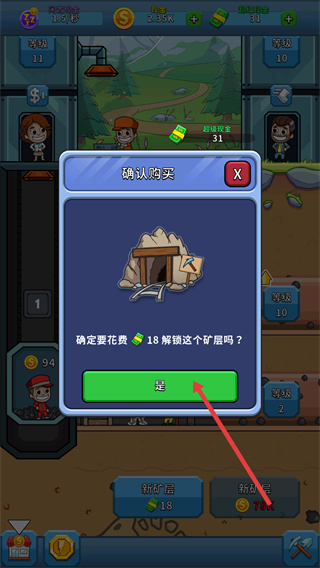 3、彈出確認購買彈窗時,直接點擊綠色的【是】按鈕確認解鎖礦層,破解版會讓消耗的資源反向增加。