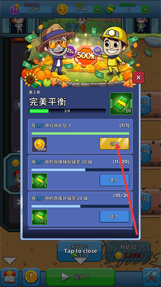 4、完成打開礦層3的任務后,找到任務欄中的【領取】按鈕點擊,獲取對應金幣獎勵,為后續(xù)升級攢資源。