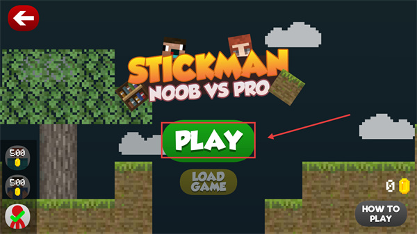 1、在【STICKMAN-NOOB-VS-PRO】主界面,點擊【PLAY】按鈕進入關(guān)卡,可先了解該火柴人競技類玩法的核心是生存與資源收集。